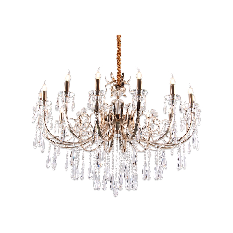 Đèn Chùm được thiết kế với hình dáng tròn cổ điển, gồm 16 tay đèn uốn cong mềm mại, bố trí đối xứng hài hòa. Những dải pha lê cắt tỉ mỉ rủ xuống từng tầng, tạo nên hiệu ứng ánh sáng lung linh đầy mê hoặc – đặc trưng của những mẫu đèn chùm cao cấp.